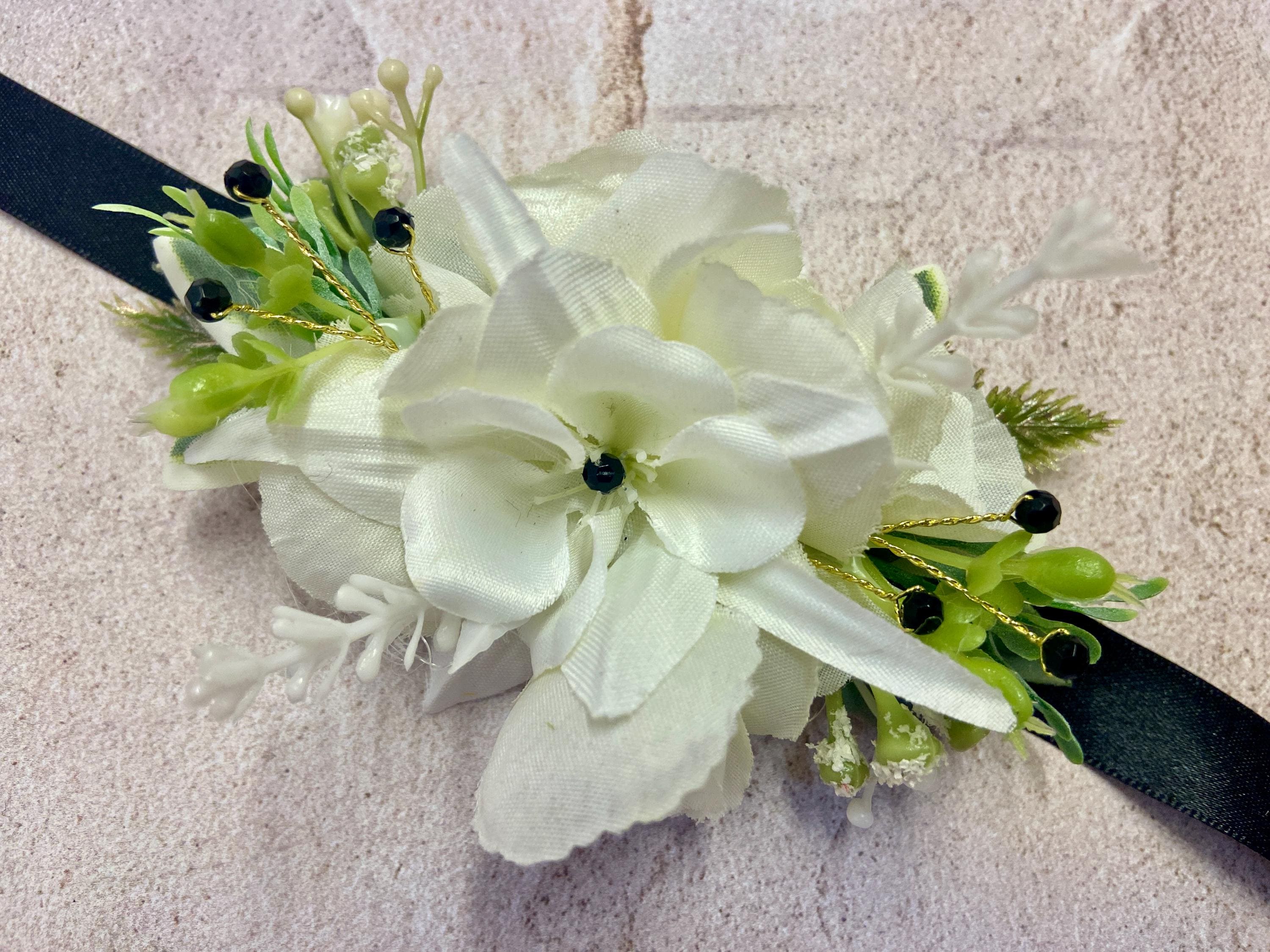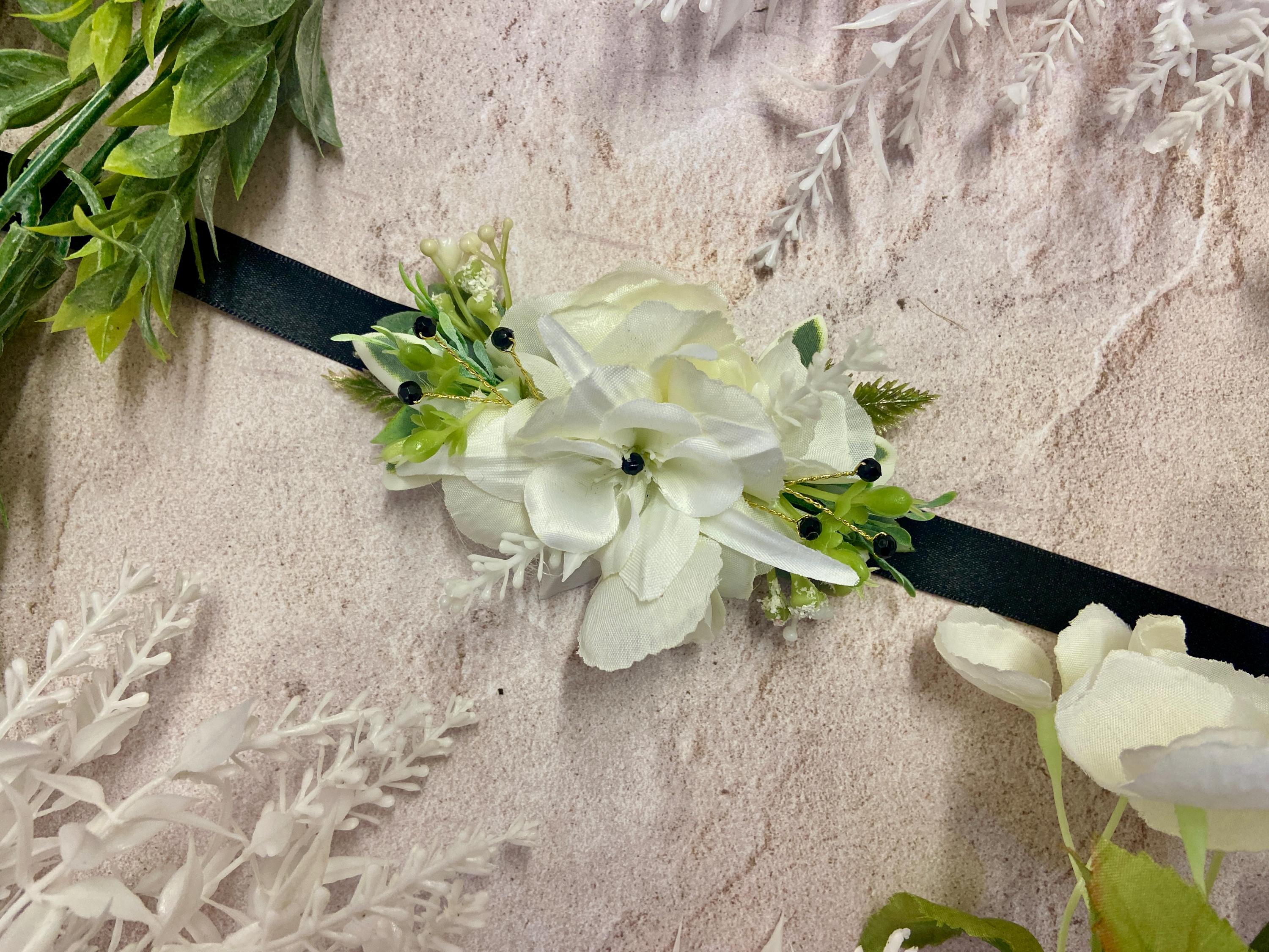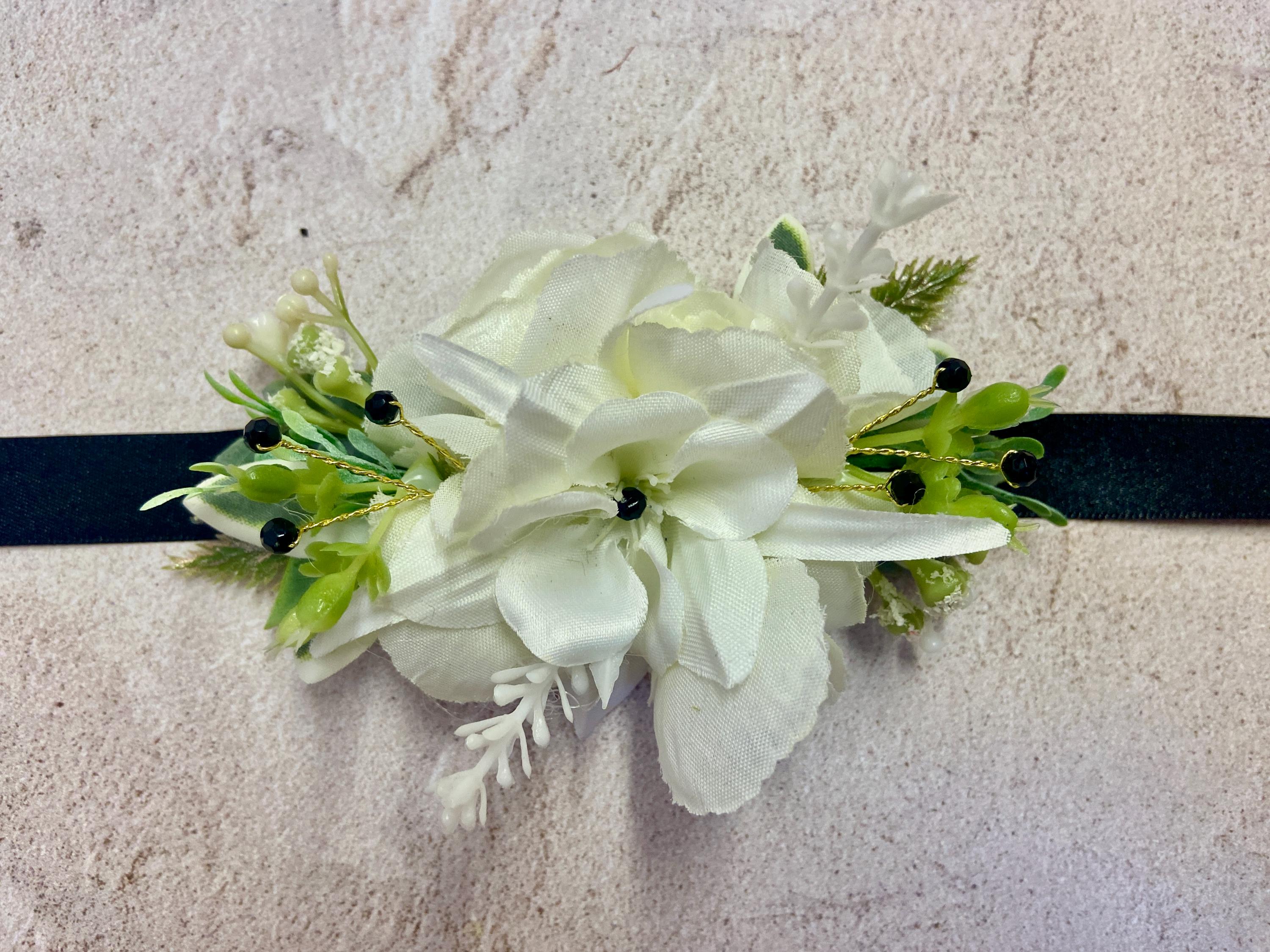 This beautiful Wrist Corsage has been handmade using a White Columbine (Aquilegia) head, White Flowers, White Harvest Leaves, Euphorbia Leaves, Thyme, Green/Grey Lavender Ruscus, Fern Leaves, and White Wild Flowers. Black Diamantés have been added for a touch of 'Bling'. It has been made on a Black Satin Ribbon.