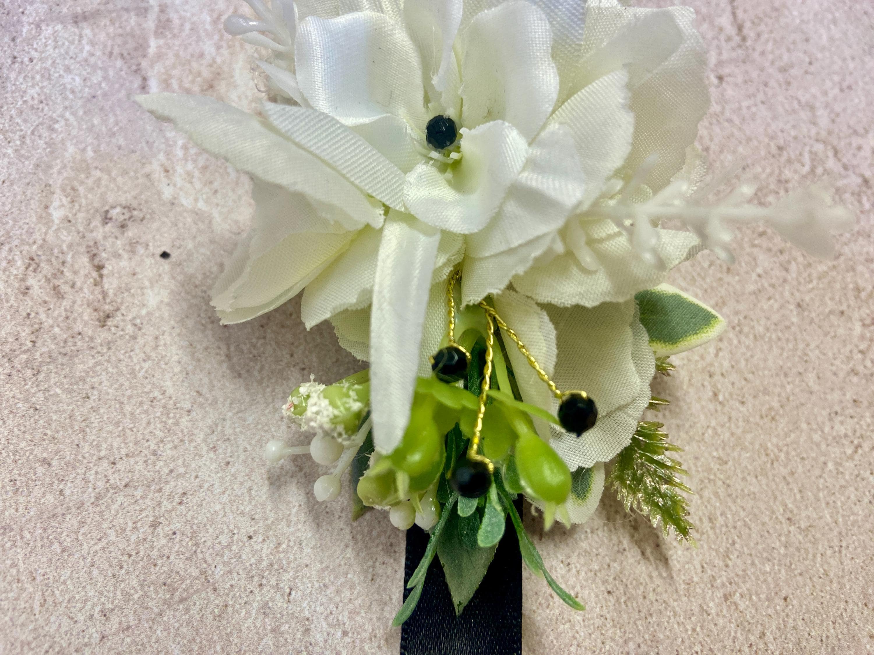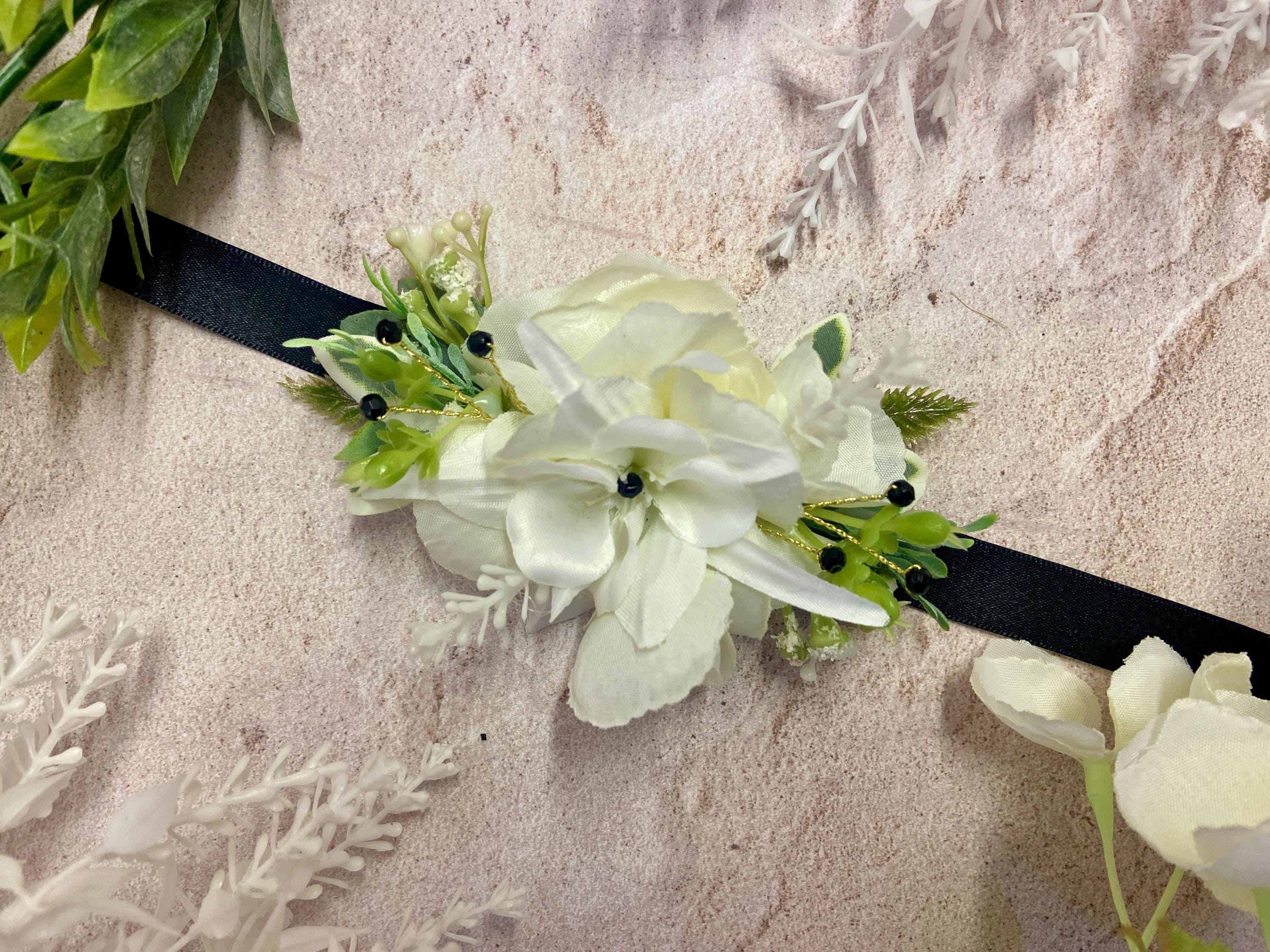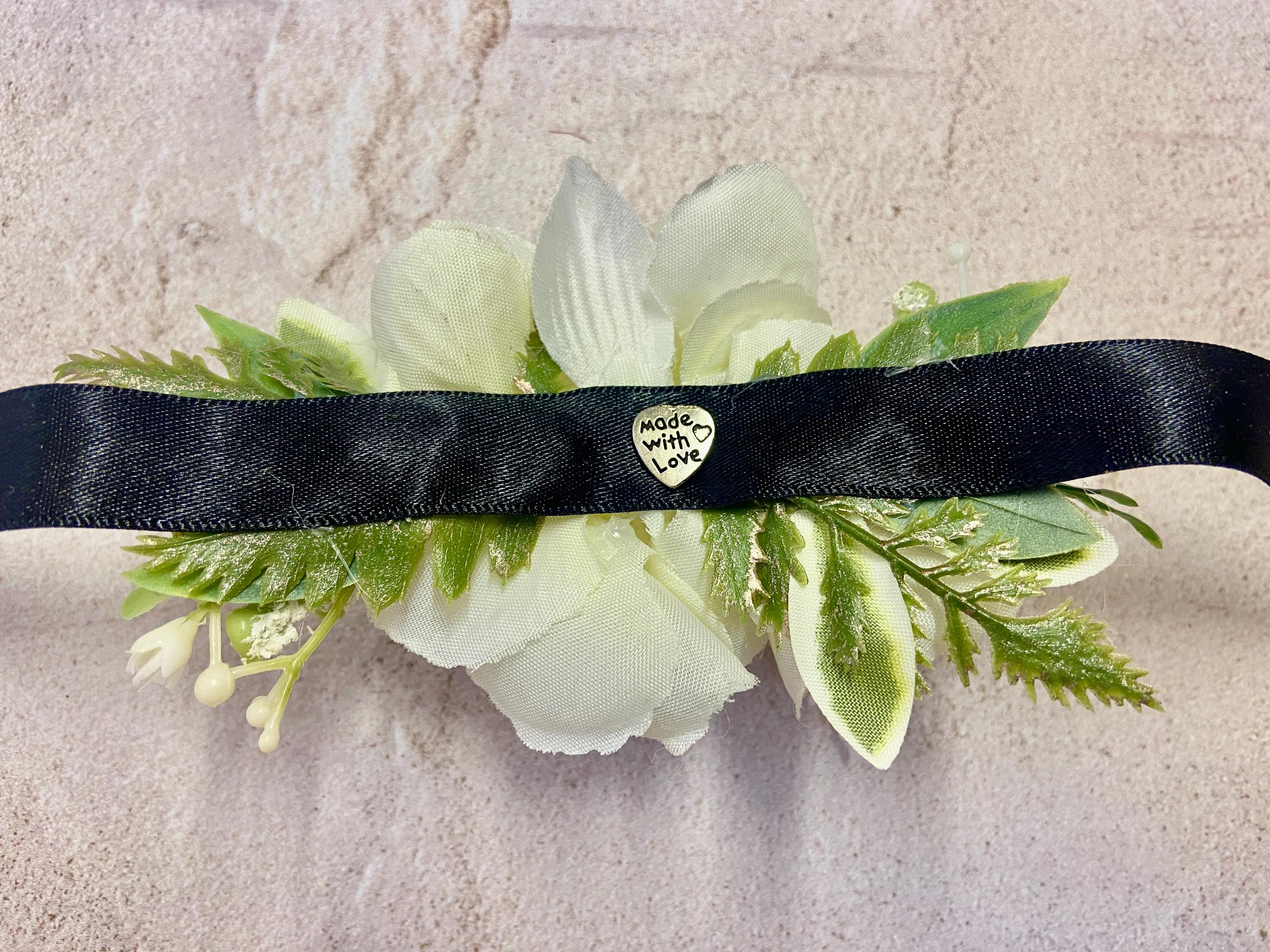 This beautiful Wrist Corsage has been handmade using a White Columbine (Aquilegia) head, White Flowers, White Harvest Leaves, Euphorbia Leaves, Thyme, Green/Grey Lavender Ruscus, Fern Leaves, and White Wild Flowers. Black Diamantés have been added for a touch of 'Bling'. It has been made on a Black Satin Ribbon.