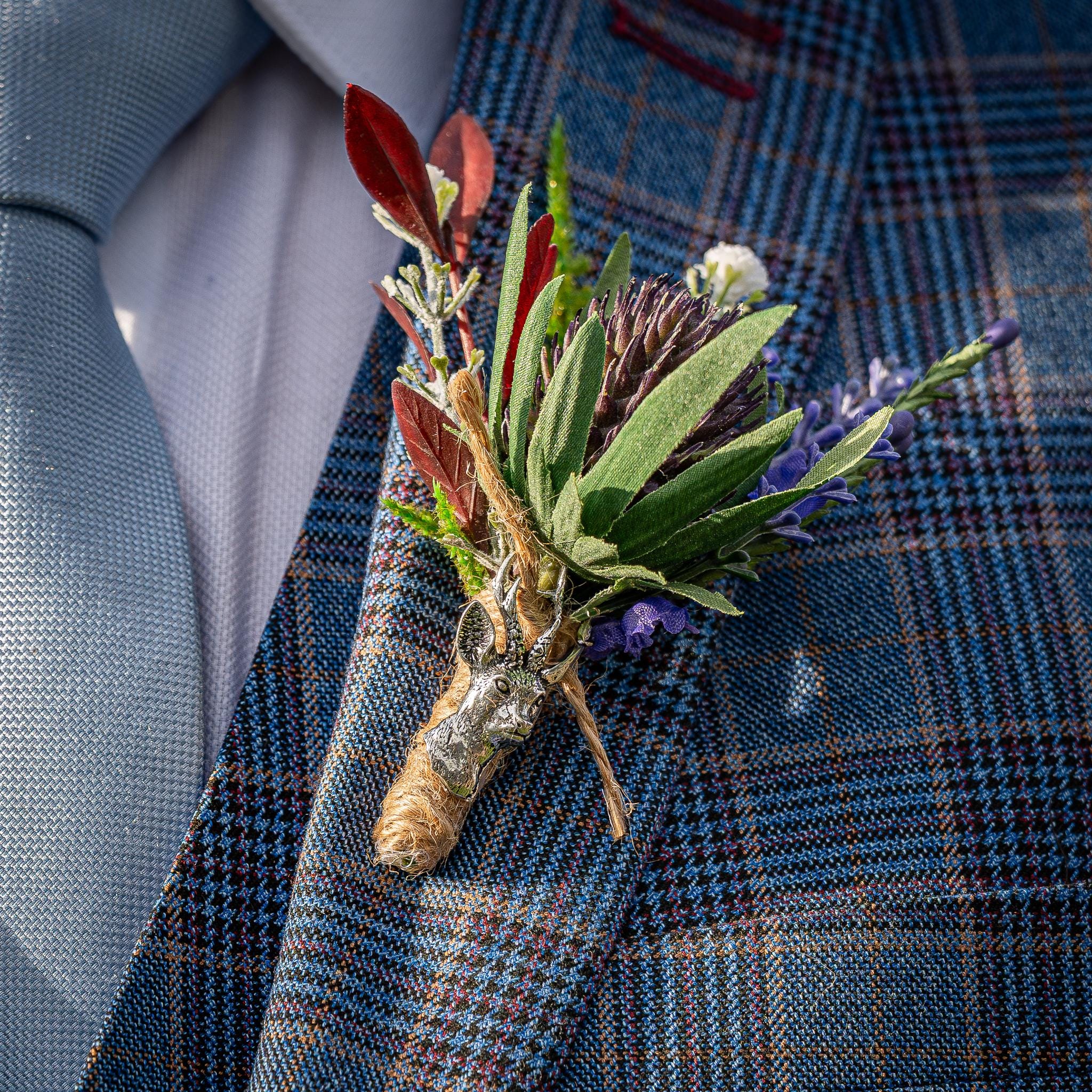 This "stand out from the crowd" buttonhole has been handmade using a Purple Teasel Cone Flower Thistle stem, Purple Lavender, Burgundy coloured Ruscus, Purple Heather, Lucky White Heather, and a single Fern Leaf. To finish off the look, the stems are tied together with natural jute twine and a knot. Two pearl pins have been provided. The stem has an added, Stunning Silver detailed Roe Deer, (Front Facing) Charm attached for that WOW factor.  The buttonhole comes in a clear presentation box, ideal for travelling purposes and keeping the buttonhole clean.