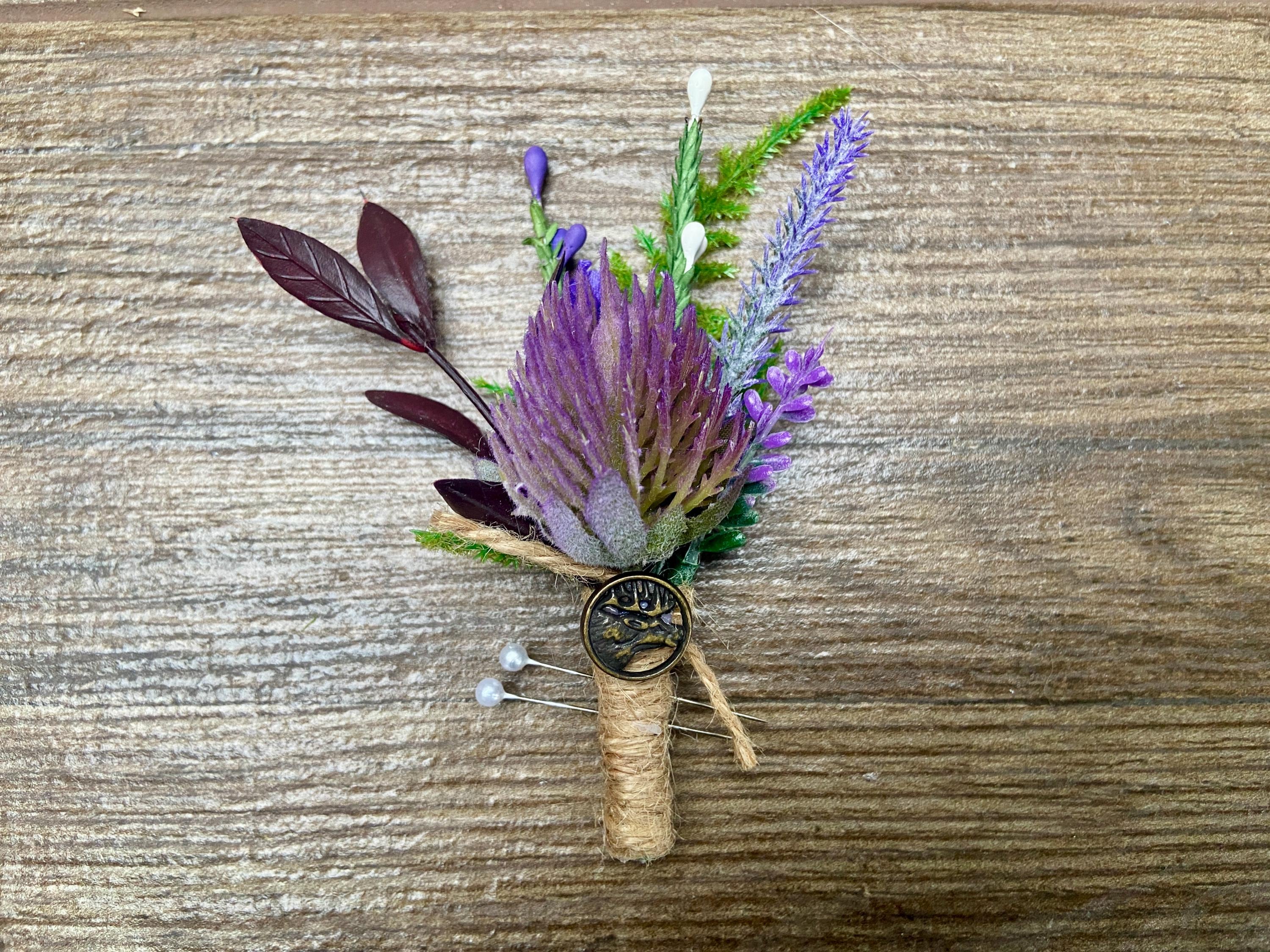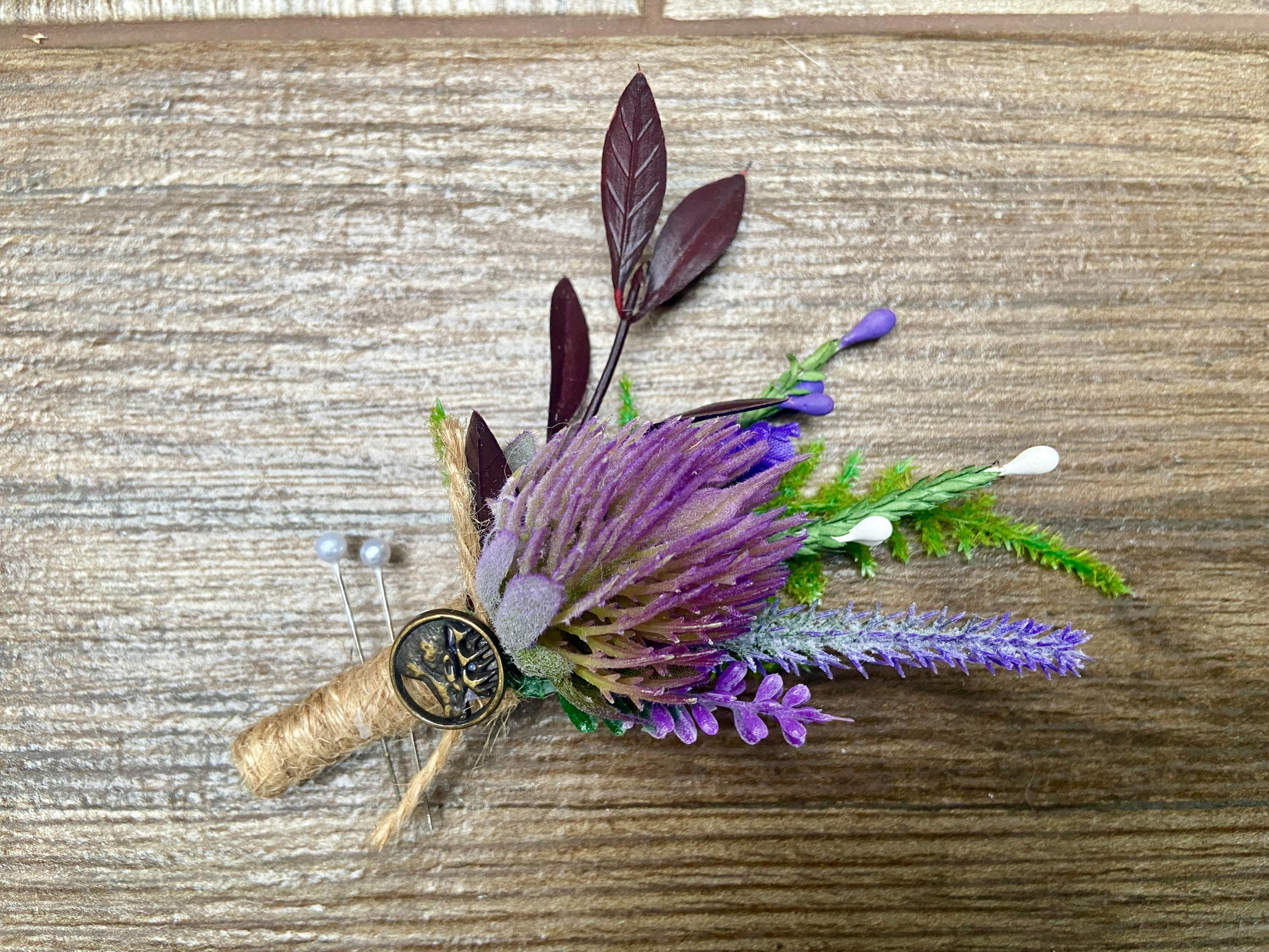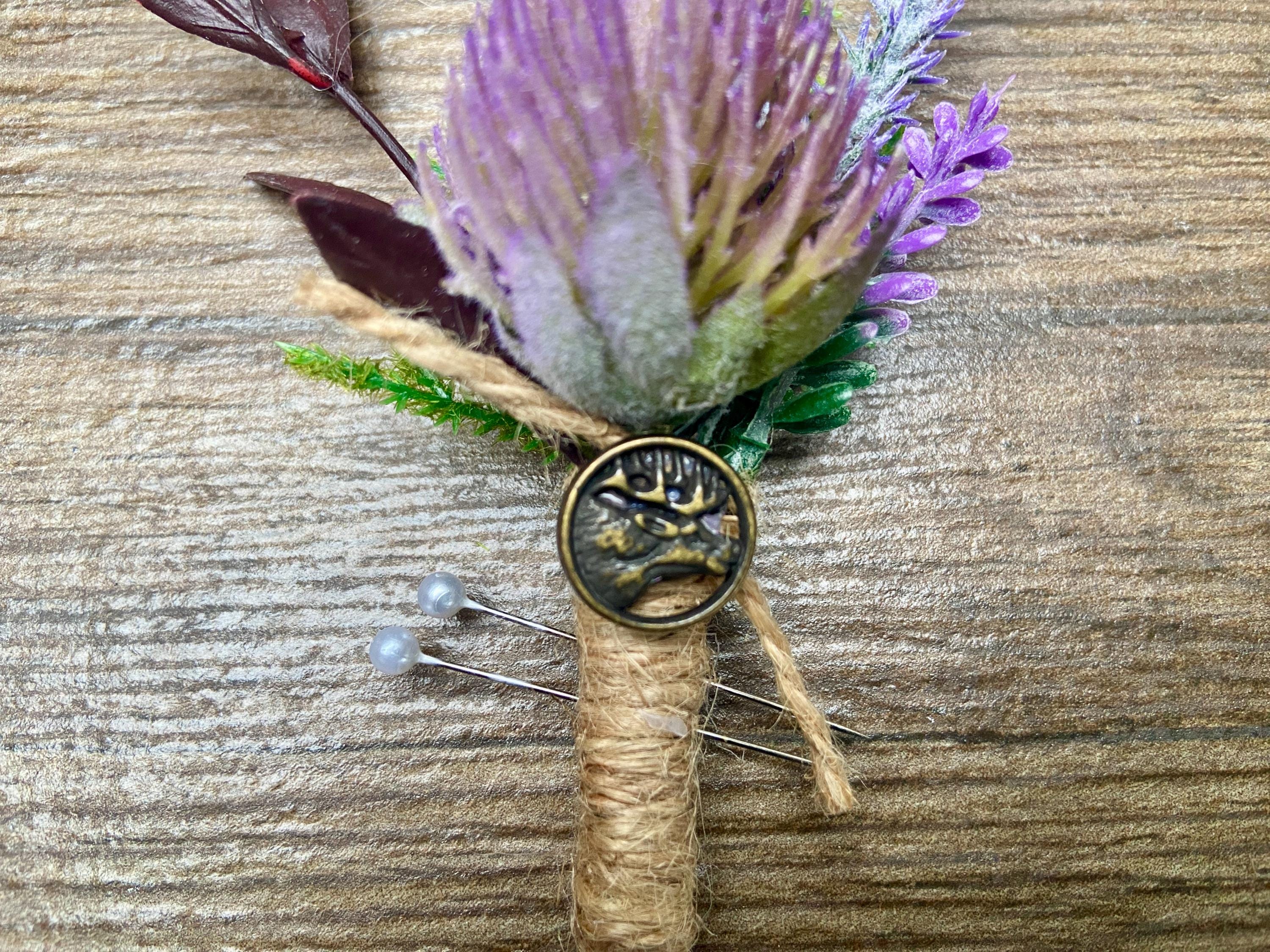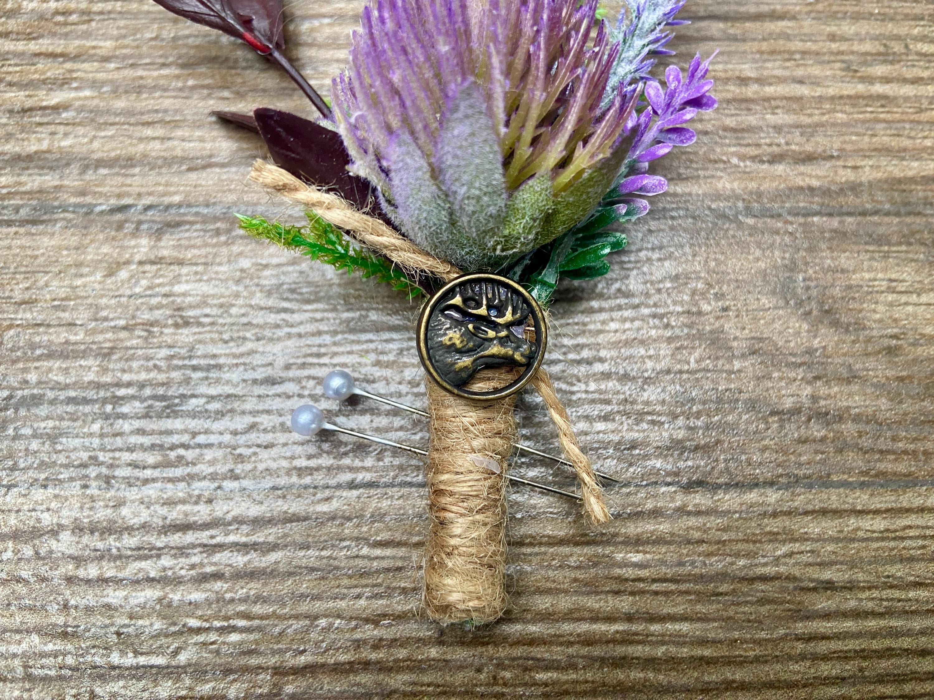 This "stand out from the crowd" buttonhole has been handmade using a Purple Thistle Teasel Cone stem, Burgundy Ruscus, Purple Heather, Purple Lavender, Lucky White Heather, and a Fern Leaf. To finish off the look, the stems are tied together with natural jute twine and tied with a jute twine knot. Two pearl pins have been provided. The stem has an added, Stunning, Round Bronze Stag Charm attached for that WOW factor.  The buttonhole comes in a clear presentation box, ideal for travelling purposes and keeping the buttonhole clean.