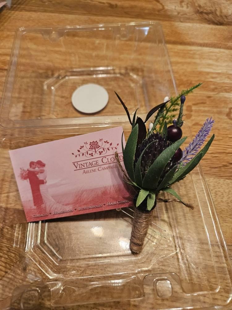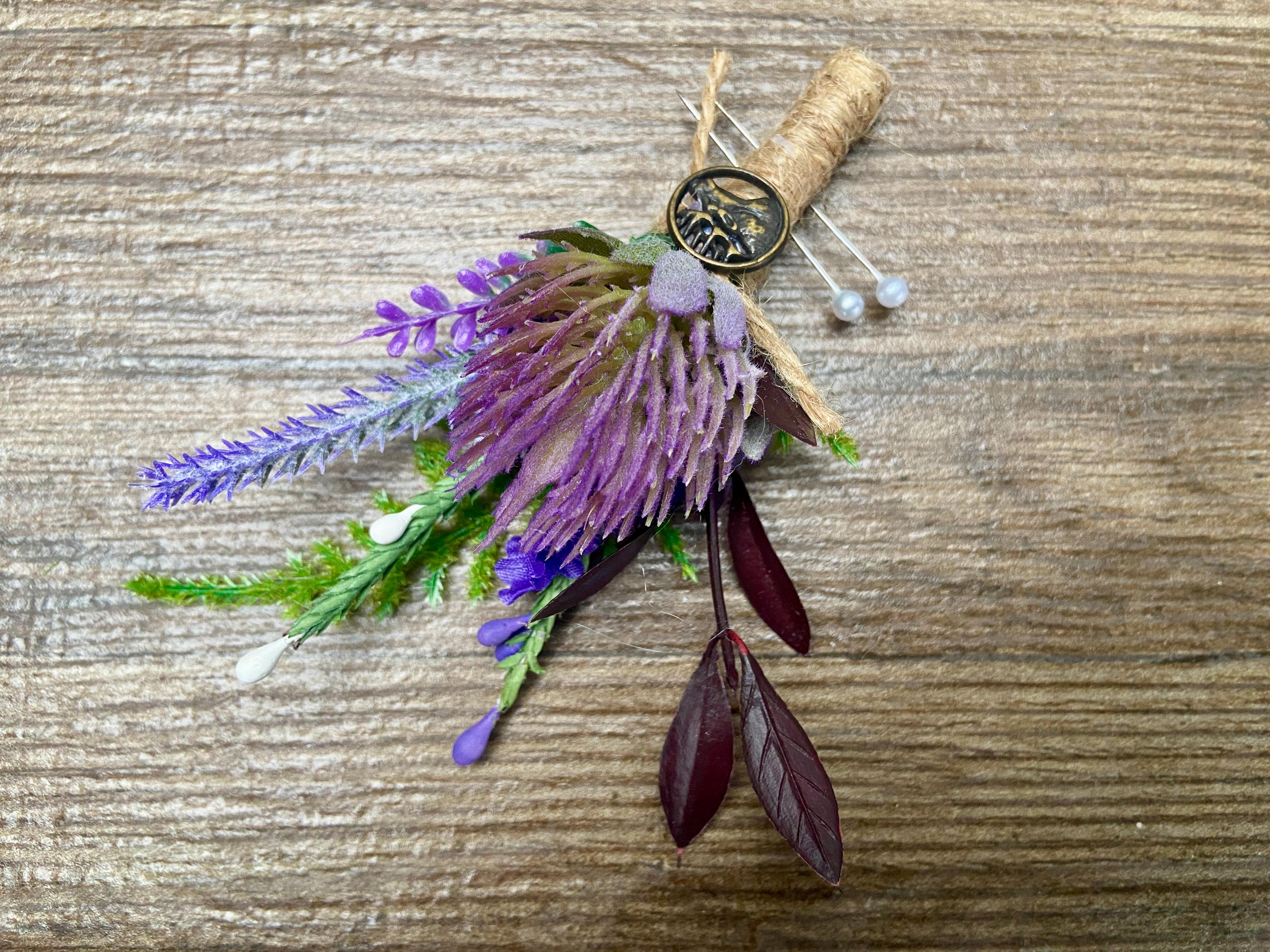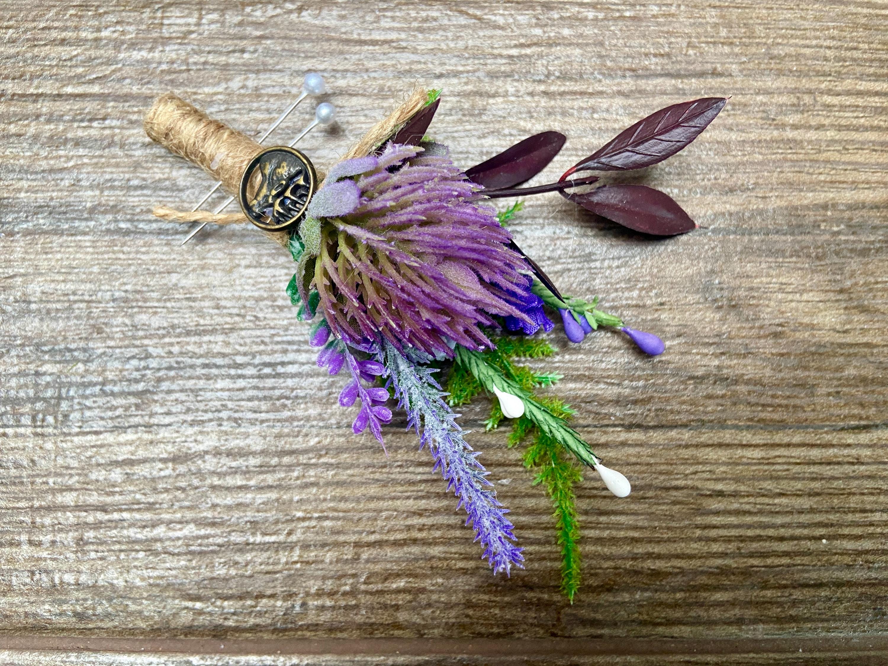 This "stand out from the crowd" buttonhole has been handmade using a Purple Thistle Teasel Cone stem, Burgundy Ruscus, Purple Heather, Purple Lavender, Lucky White Heather, and a Fern Leaf. To finish off the look, the stems are tied together with natural jute twine and tied with a jute twine knot. Two pearl pins have been provided. The stem has an added, Stunning, Round Bronze Stag Charm attached for that WOW factor.  The buttonhole comes in a clear presentation box, ideal for travelling purposes and keeping the buttonhole clean.
