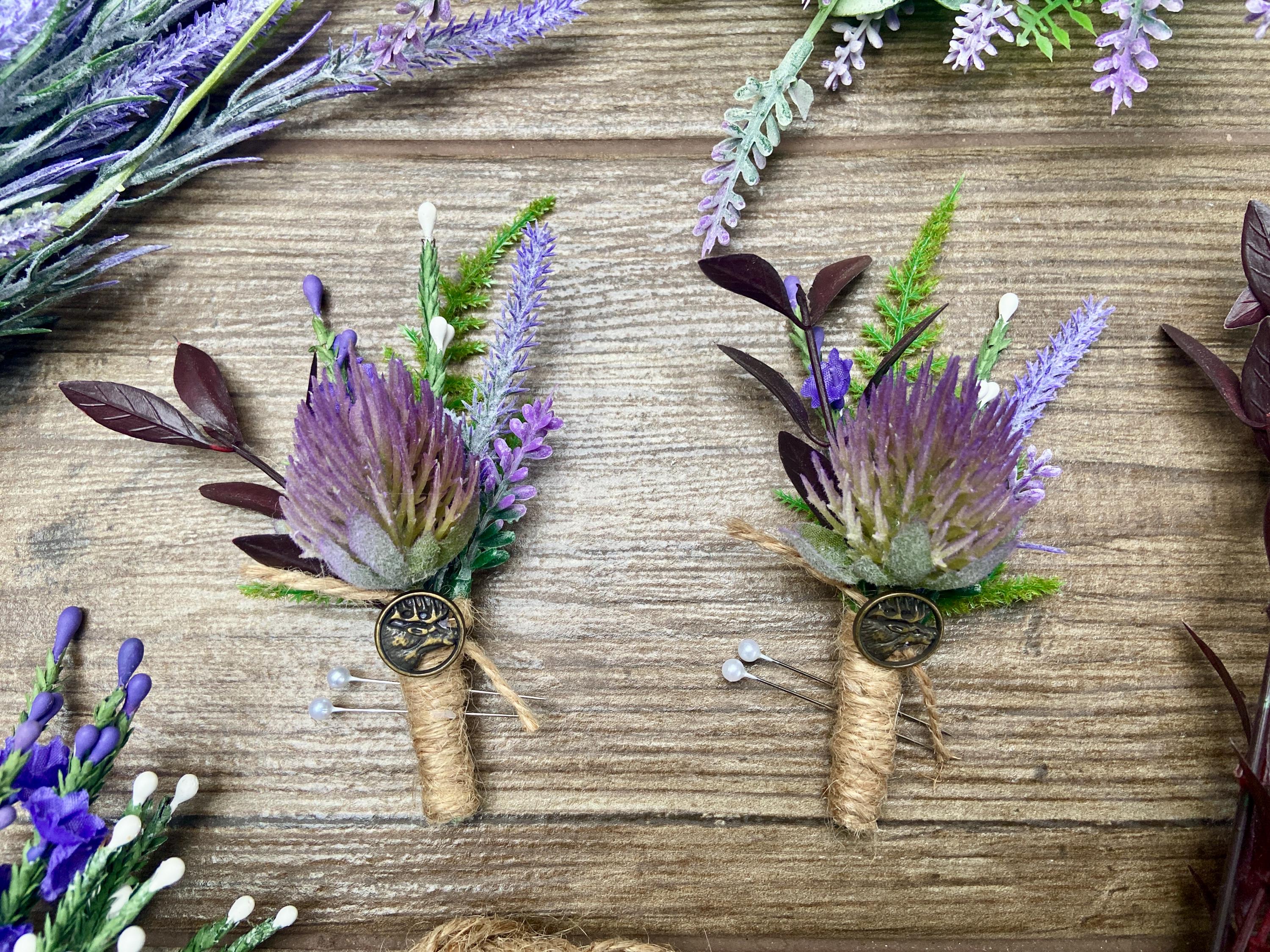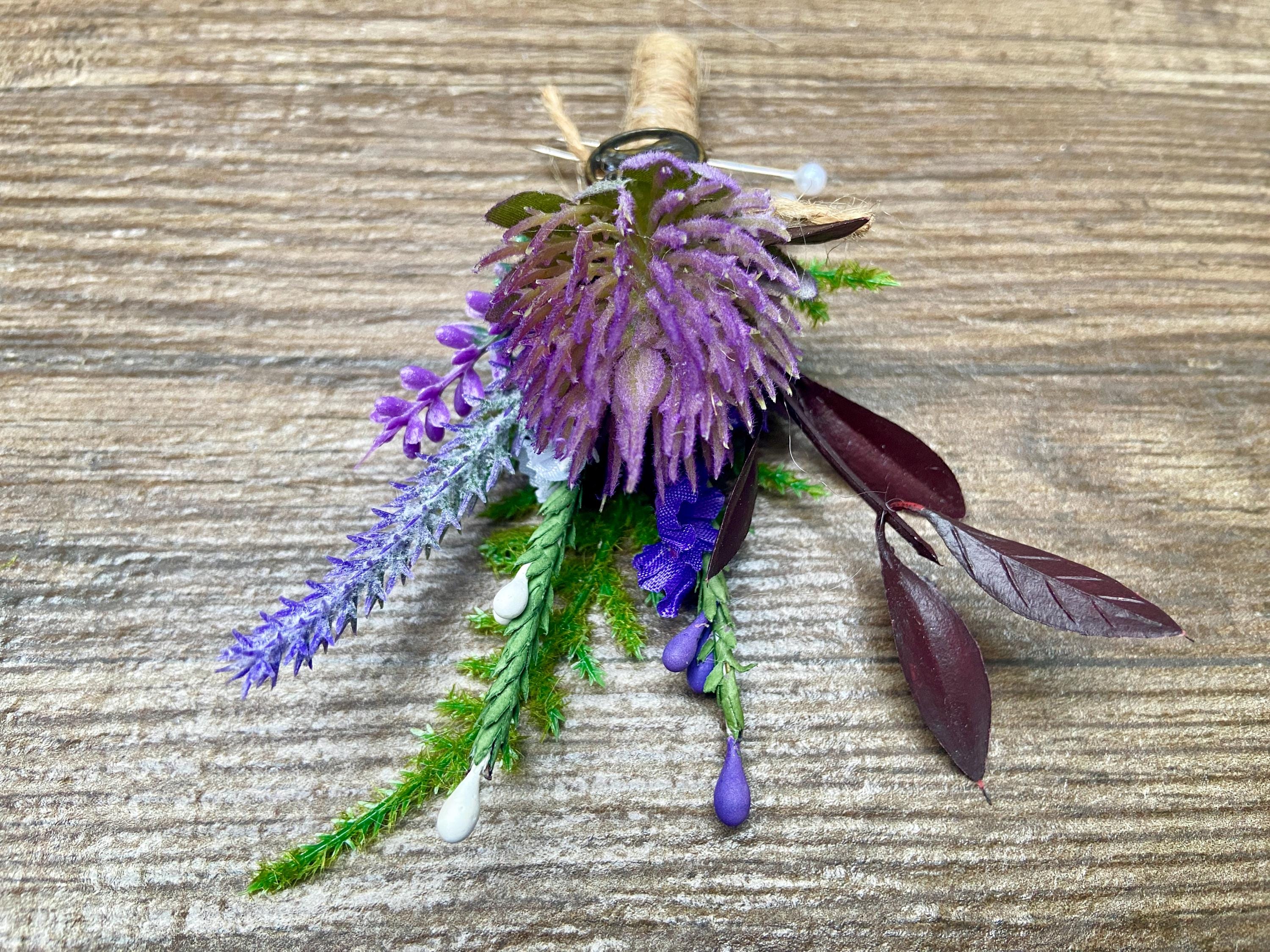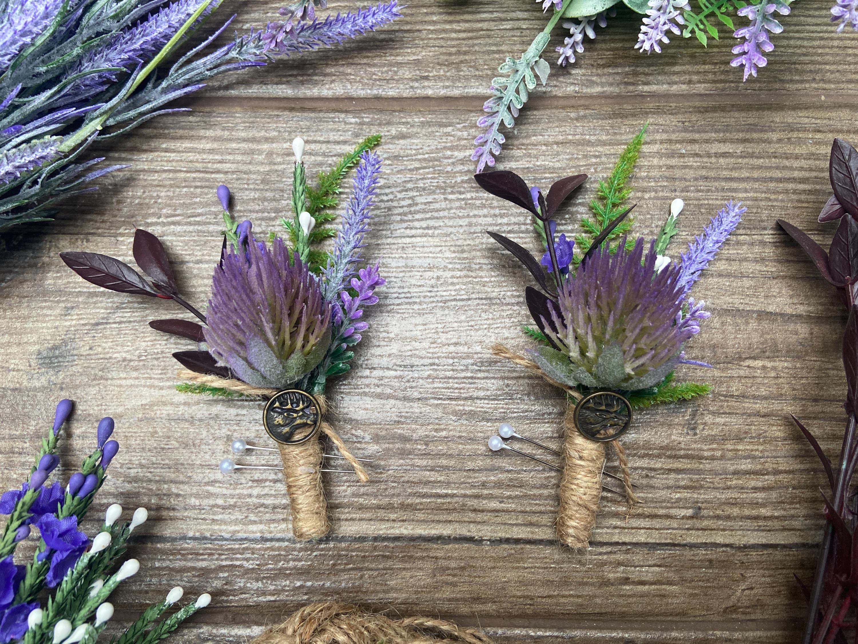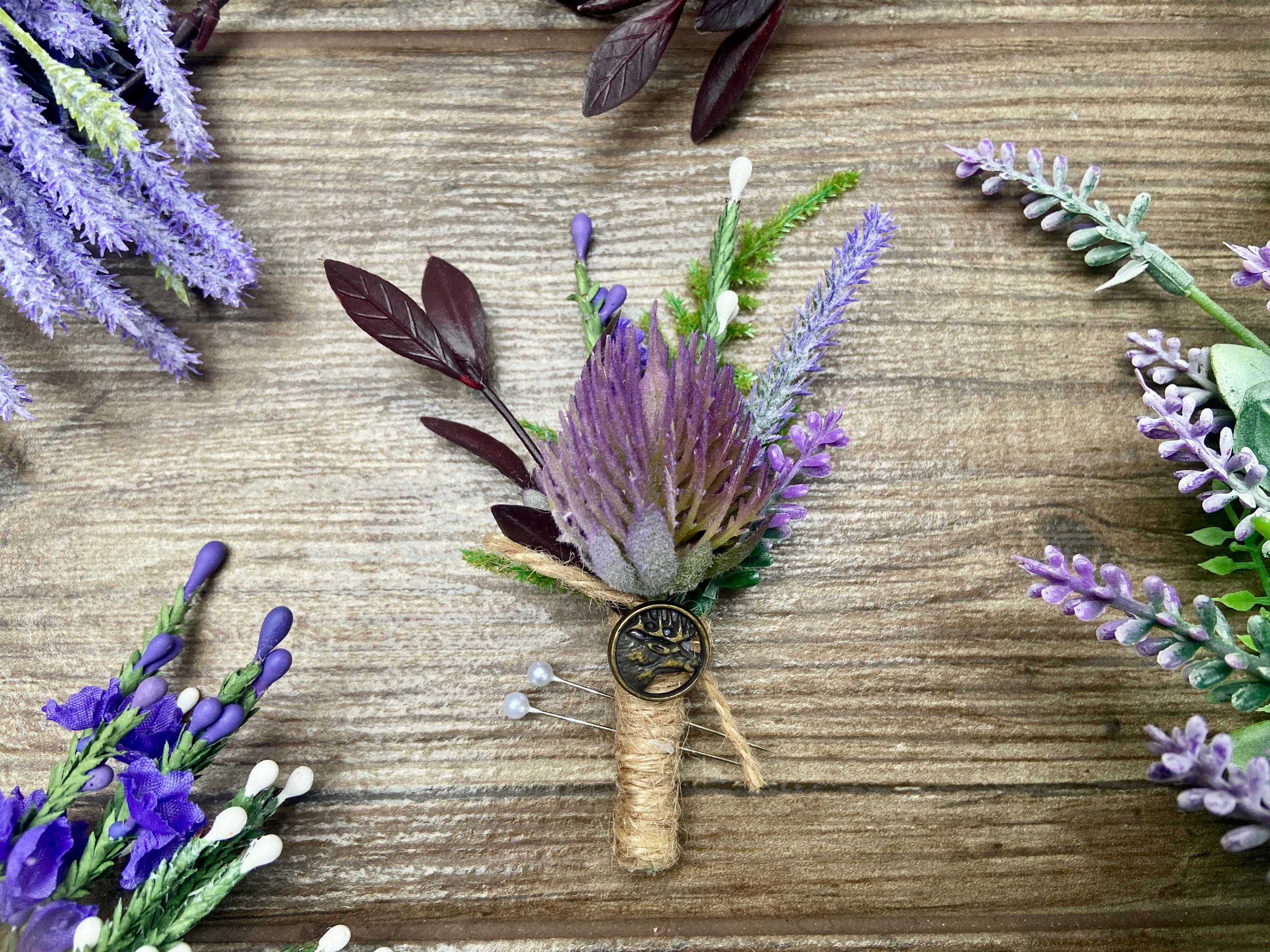 This "stand out from the crowd" buttonhole has been handmade using a Purple Thistle Teasel Cone stem, Burgundy Ruscus, Purple Heather, Purple Lavender, Lucky White Heather, and a Fern Leaf. To finish off the look, the stems are tied together with natural jute twine and tied with a jute twine knot. Two pearl pins have been provided. The stem has an added, Stunning, Round Bronze Stag Charm attached for that WOW factor.  The buttonhole comes in a clear presentation box, ideal for travelling purposes and keeping the buttonhole clean.