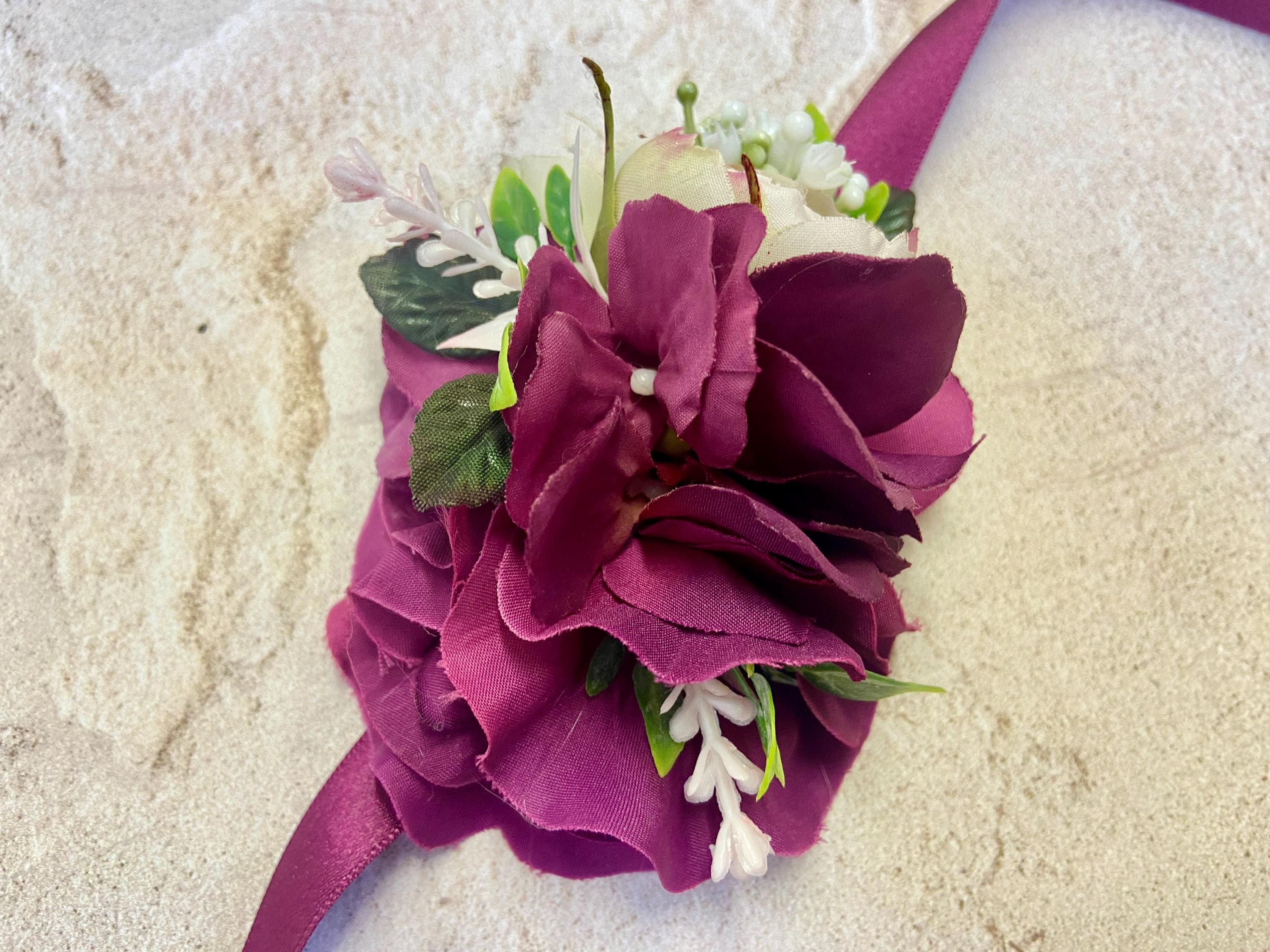 Ladies Floral Artificial Vintage Pale Pink Rose/Burgundy Hydrangea Wrist Corsage, Made On A Wine Satin Ribbon. Comes With presentation box.