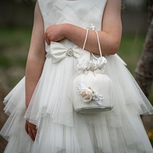 A beautiful flower girl or bridesmaids basket. The basket is made with ivory satin. It is fully lined with a silky lining, and is reinforced to keep its shape. Ivory open roses, ivory/green small hydrangea, ivory/green flowers, queen anne's lace, pom pom flowers, bridal foliage and hanging satin ribbons, give the basket that elegant bridal look. The perfect accessory for any special little girl on your big day or, a stunning accessory for the beautiful bridesmaid.