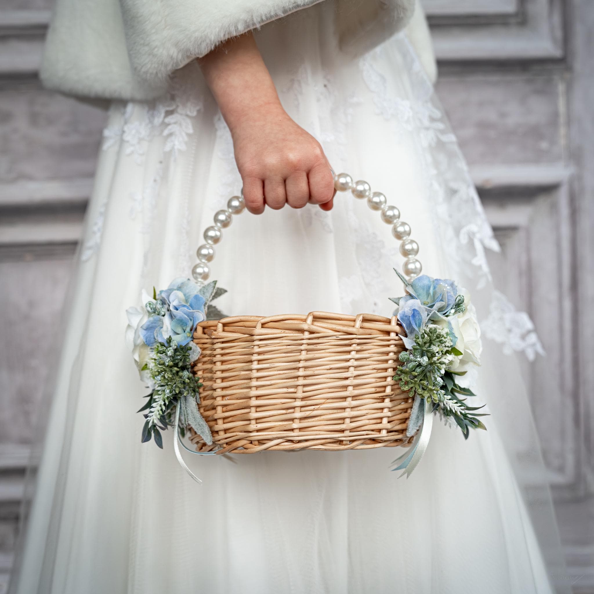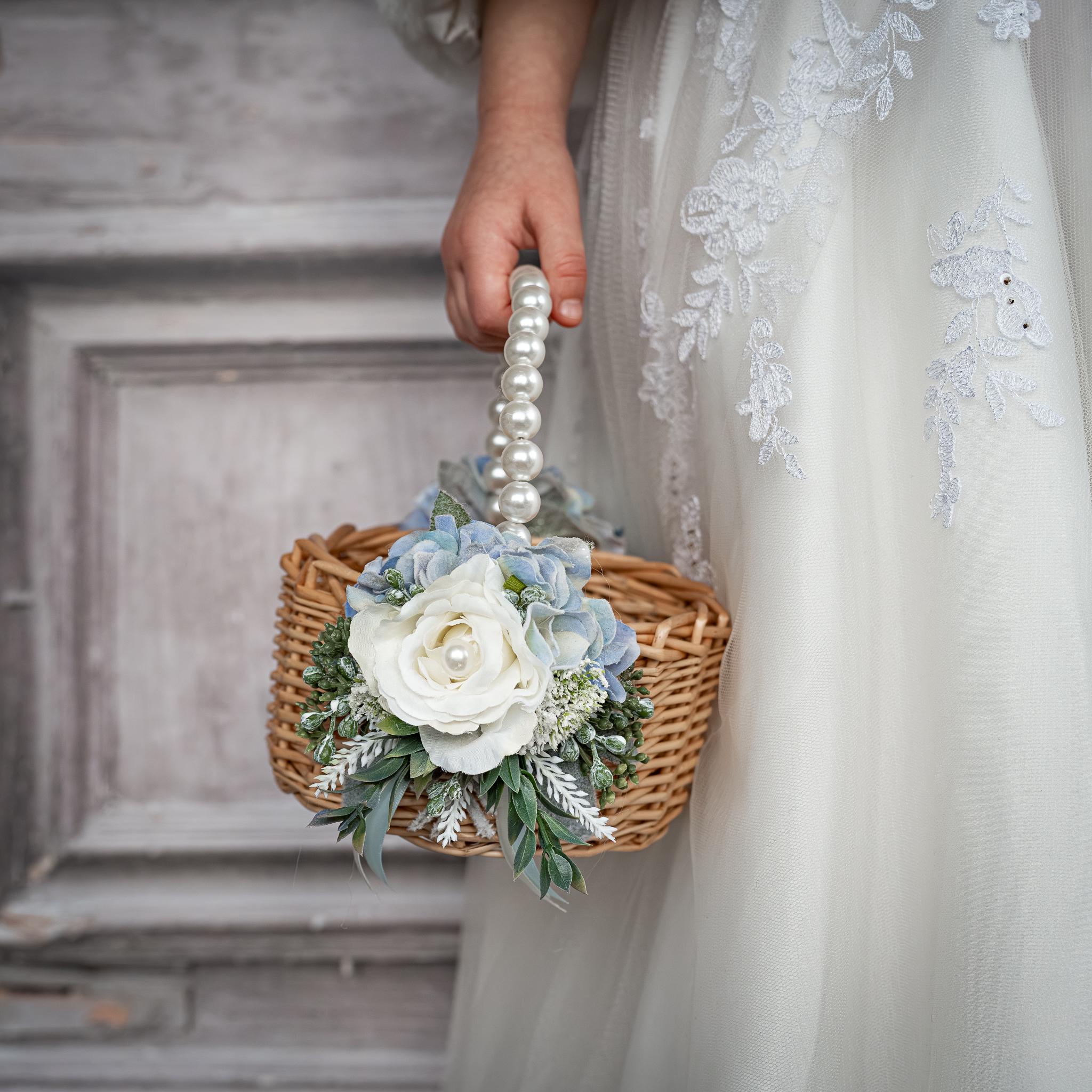 Ivory Rose and Pale Blue Hydrangea, Natural Wicker With Ivory Pearl Handle, Flower Girl Basket