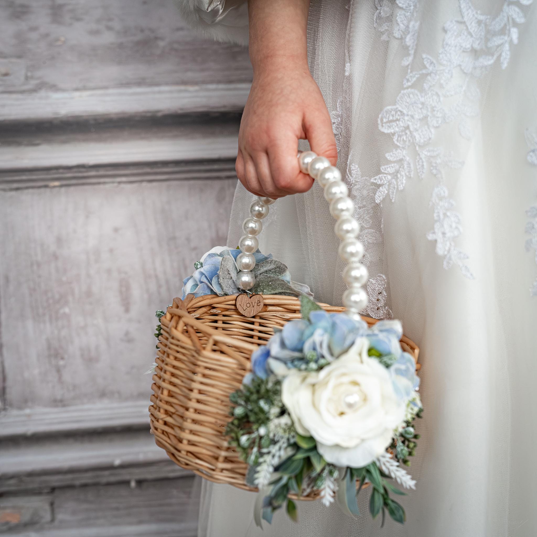 A beautiful Ivory open Rose and Pale Blue Frosted Hydrangea, Natural Wicker Basket with an Ivory Pearl handle. The sides of the basket are adorned with stunning faux flowers - open Ivory Roses with large pearls in the centre, Pale Blue Frosted Hydrangea, White Lavender, Green/Grey and Lavender Ruscus, Queen Anne's Lace, Frosted Leaves and Green Buds. There are also Pale Blue and Ivory Satin Ribbons hanging down either side of the basket for that soft, romantic touch. Inside the basket on either side are wooden heart shaped "Love" embellishments.