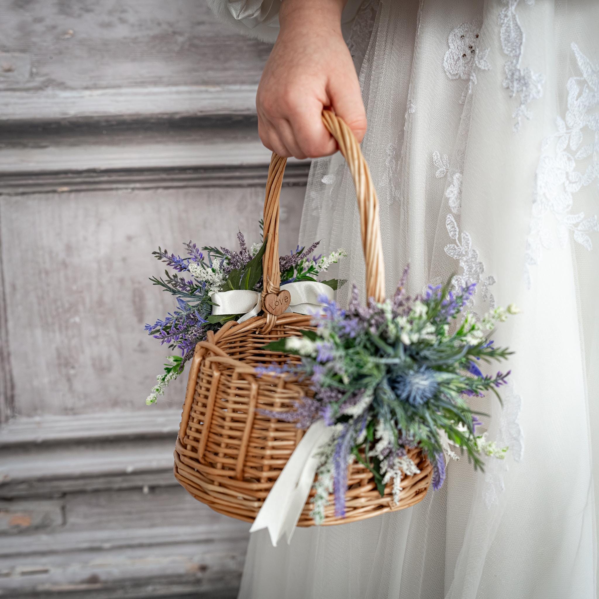 A beautiful Scottish Sea Holly Thistle Flower Girl, Natural Wicker Basket. The sides of the basket are adorned with stunning faux Scottish flowers - Scottish Sea Holly Thistles, White Astilbe, various Purple Lavenders, White Heather, Purple Heather and Foliage. There are Ivory Satin Bows and hanging Satin Ribbons down either side of the basket, giving that elegant bridal look. Inside the basket on either side are wooden heart shaped "Love" embellishments for a romantic touch.