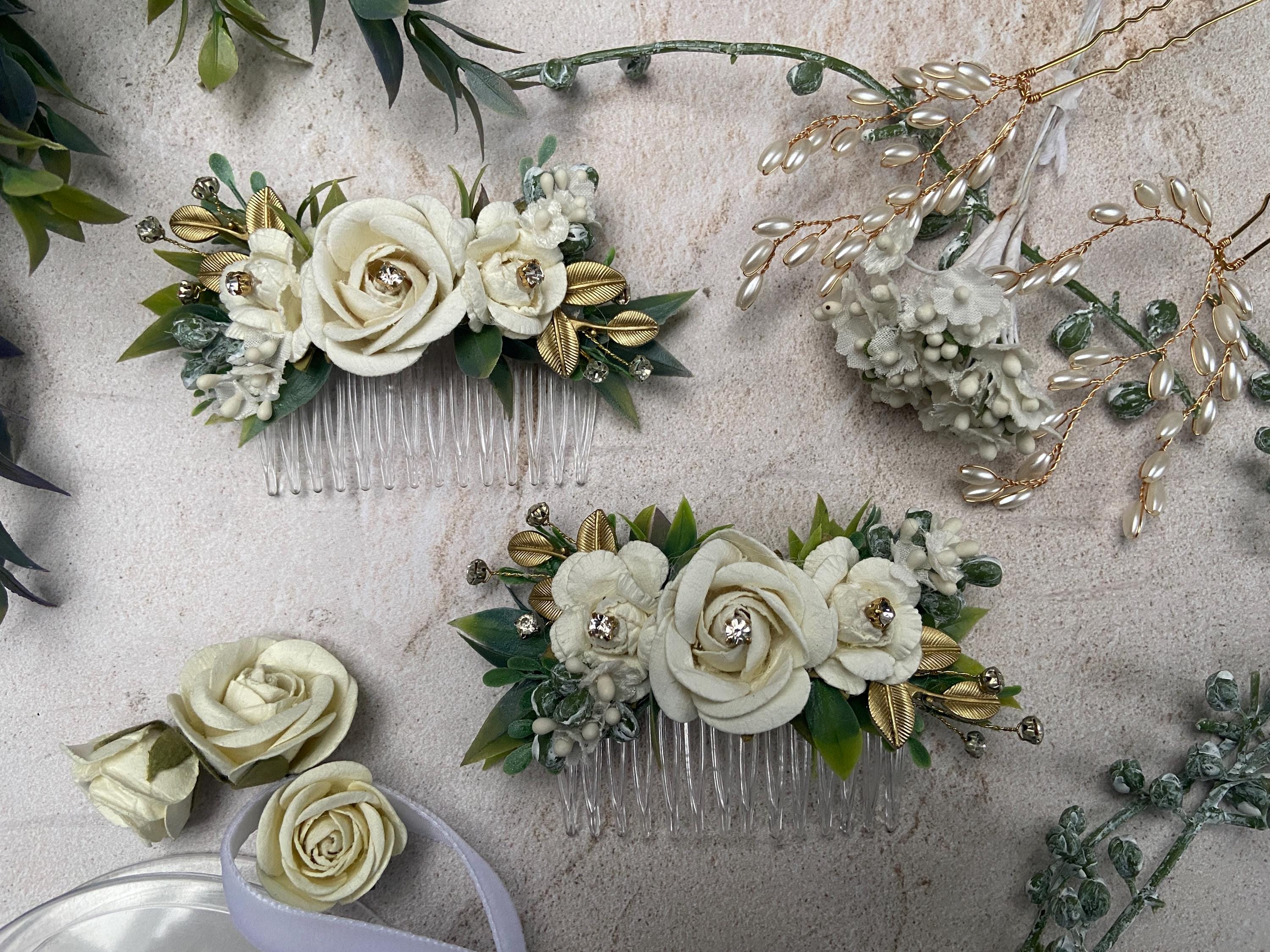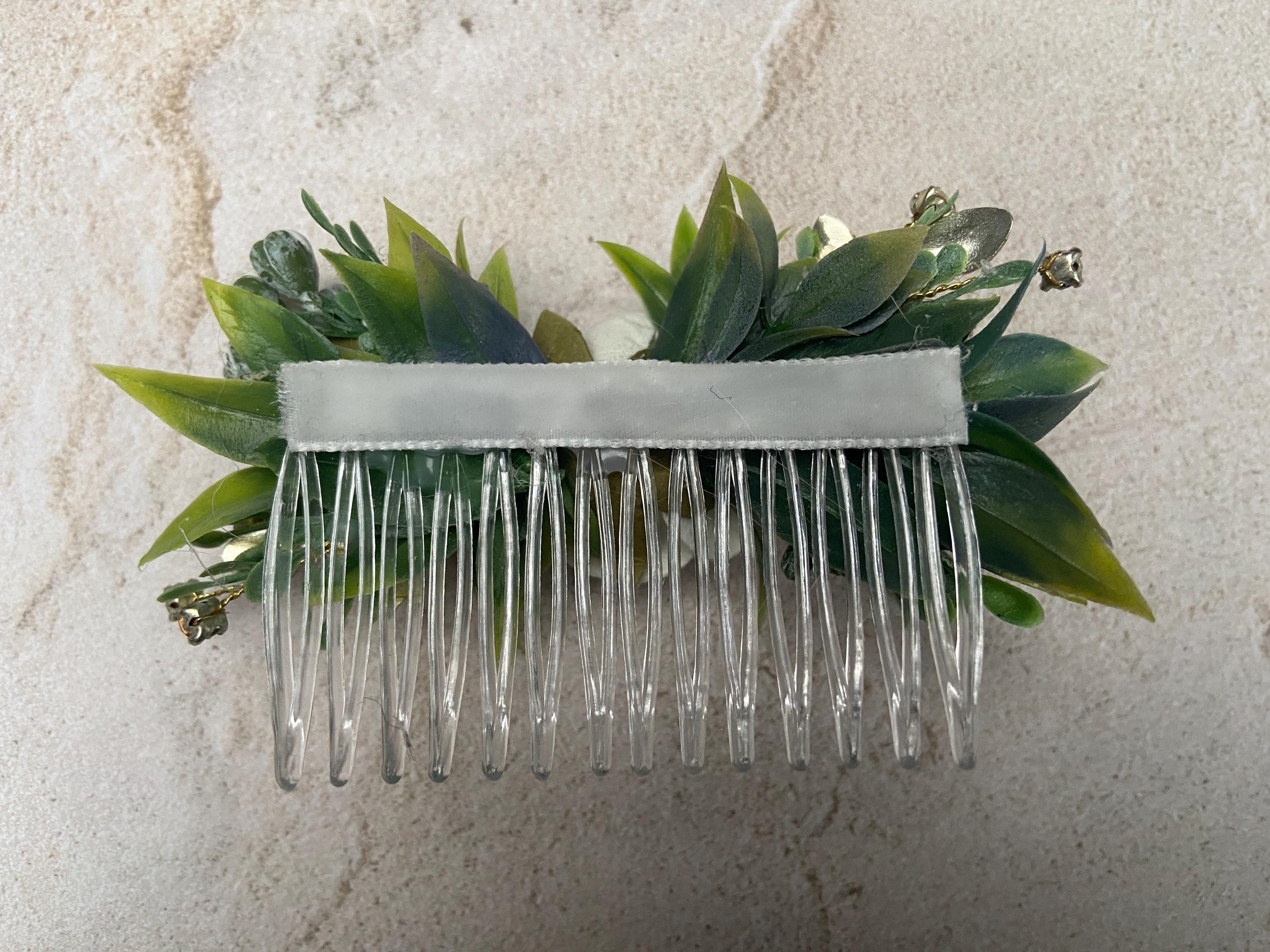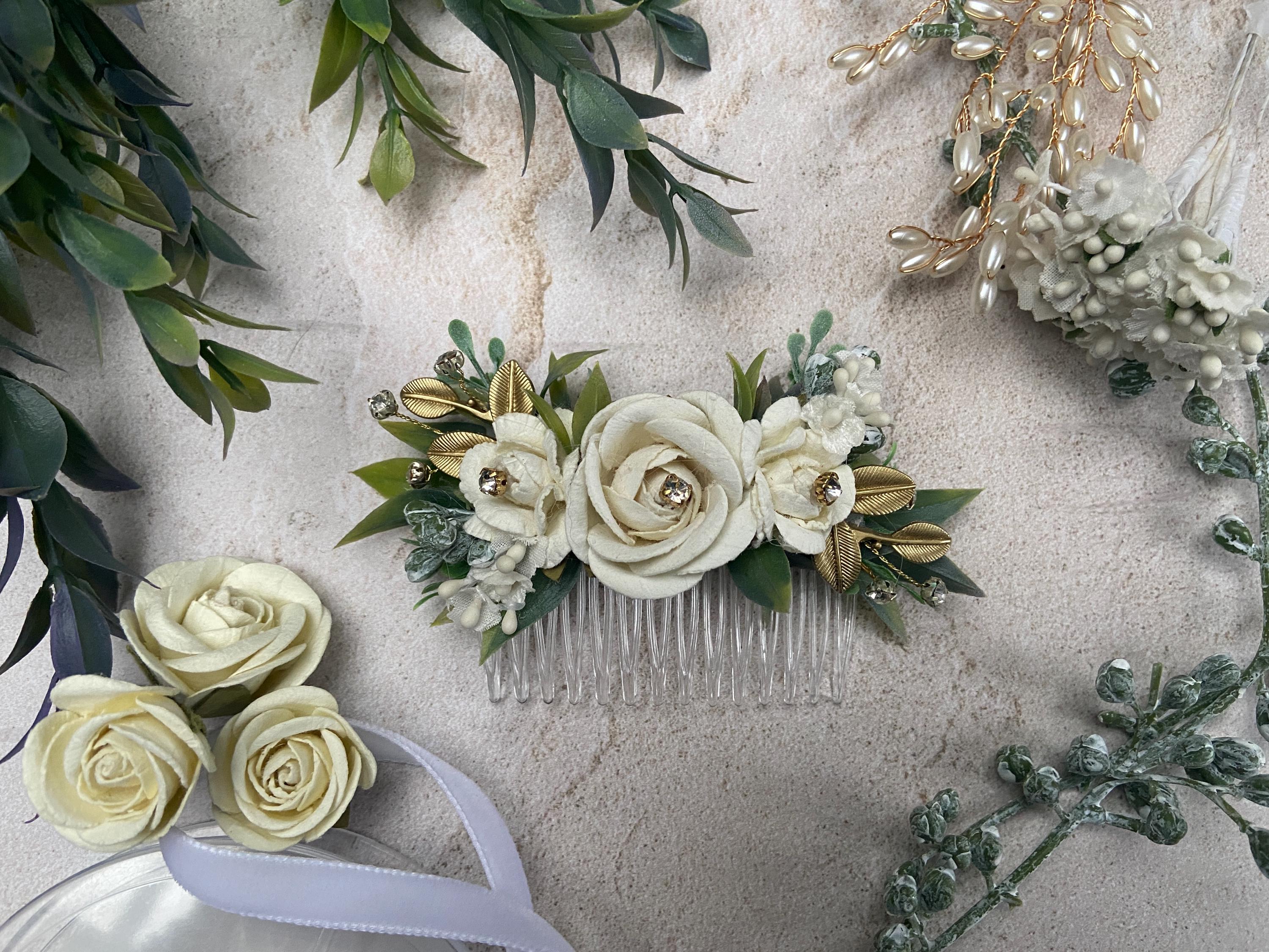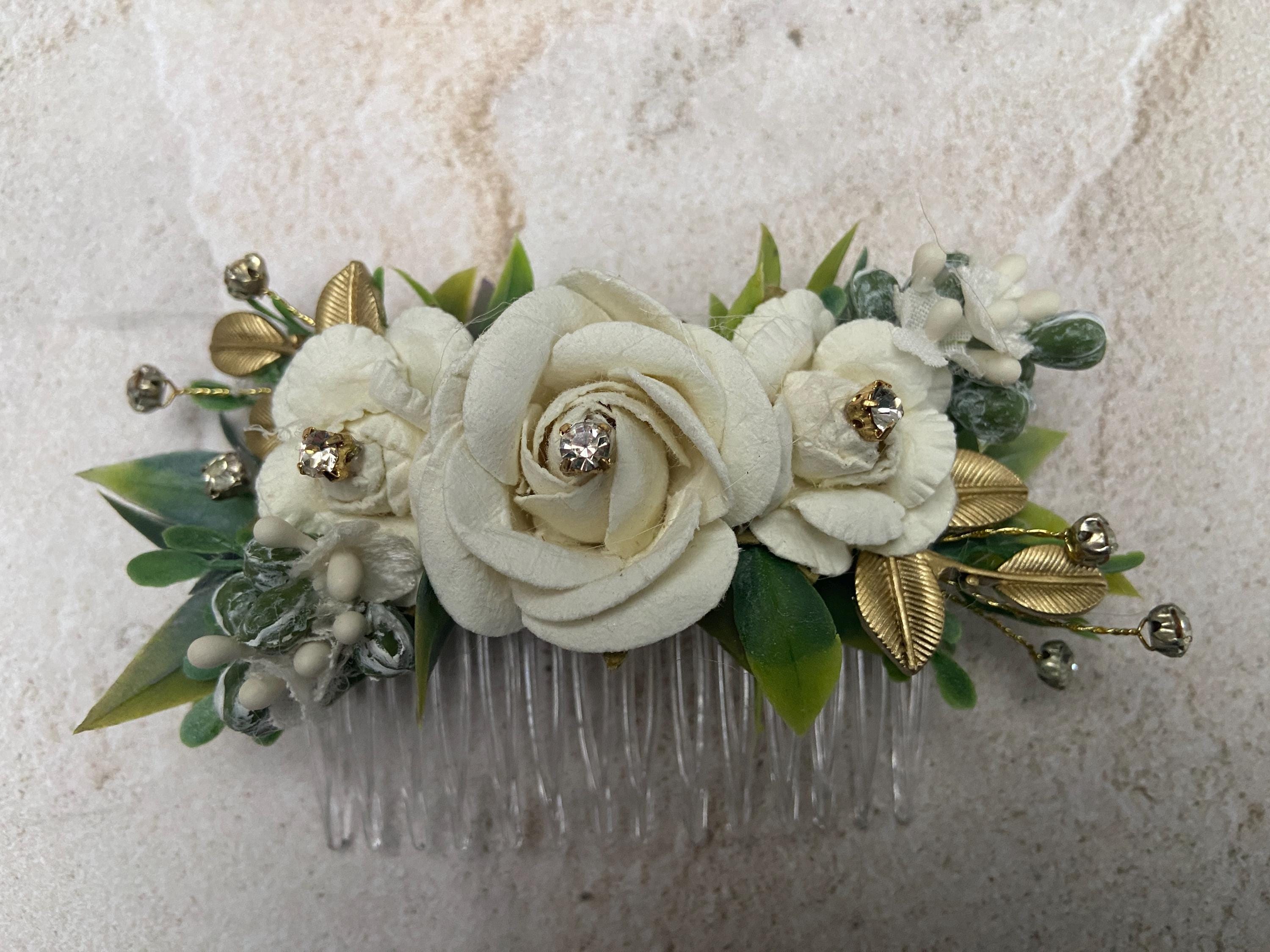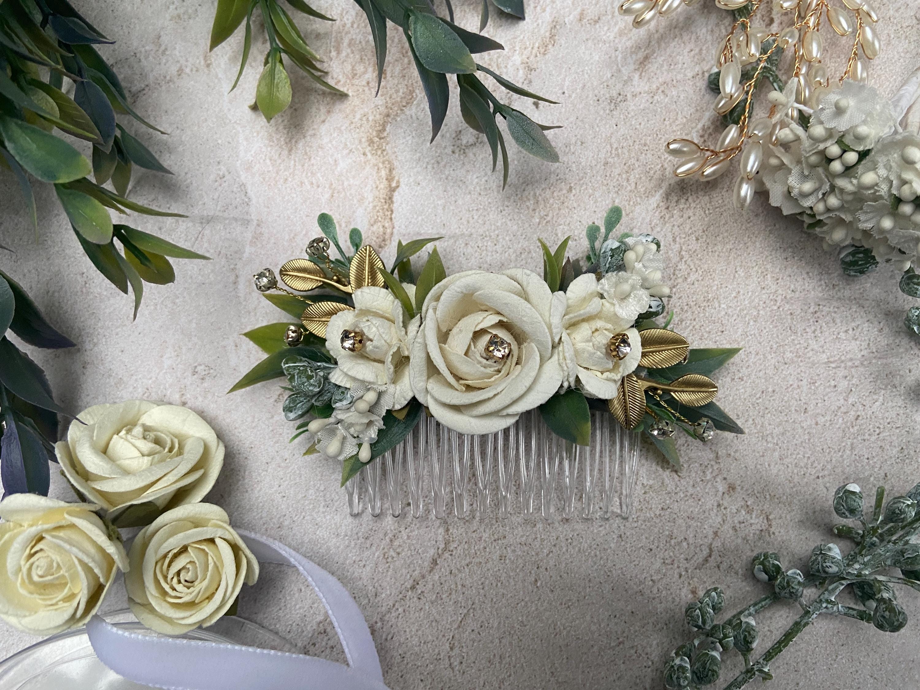 This beautiful ivory rose hair-comb, has been handmade using 3 ivory rose heads, each with a diamanté added in the centre, green/grey lavender ruscus, thyme, green and white buds, white flowers, diamantés and hand-sprayed gold metal leaves. It has been made on a clear plastic hair-comb. A "Bridal White" coloured velvet ribbon lines the back of the hair-comb for added comfort. The hair-comb comes in a clear presentation box, ideal for travelling purposes and keeping the hair-comb clean.
